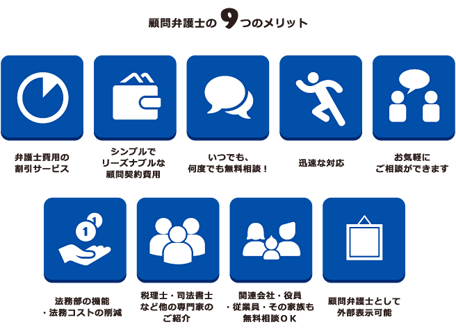 弁護士と顧問契約を締結することは、「専門家による低コストの法務部」を御社に設置することを意味します。